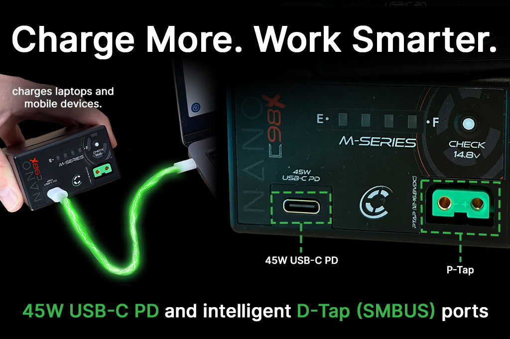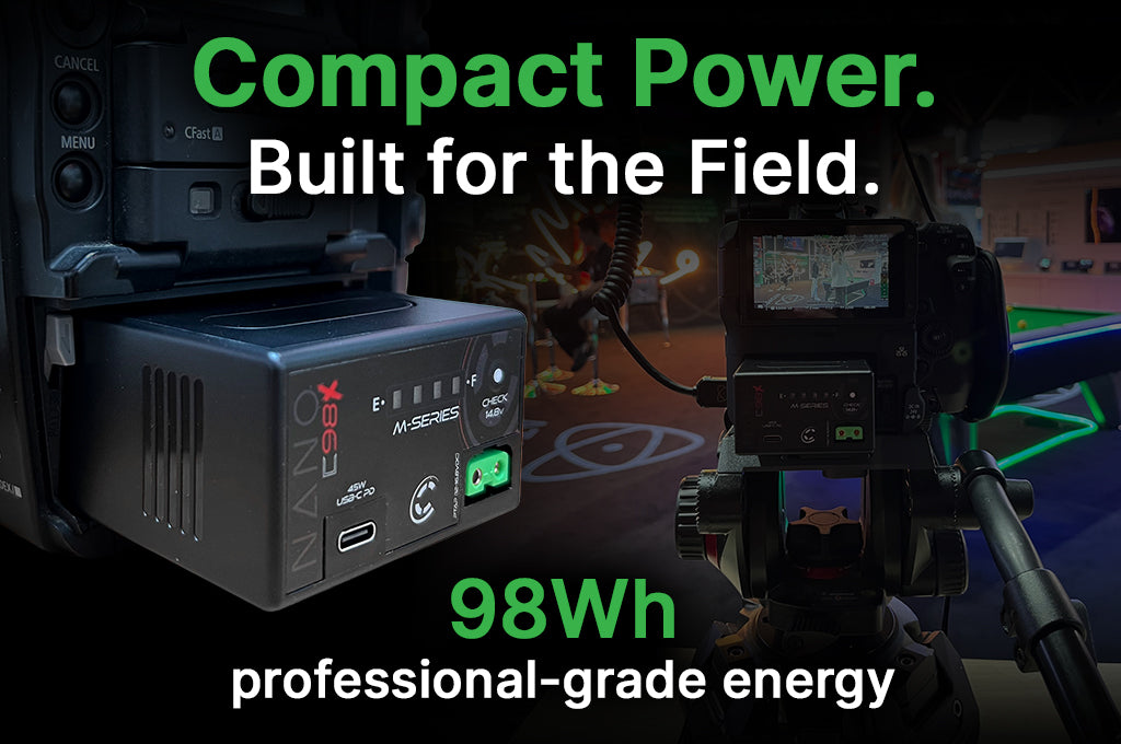The NANO-C98MX is a compact 14.8V battery designed specifically for Canon camcorder users who need professional-grade power in a travel-ready size. With a 98Wh capacity and versatile outputs—including a high-powered 45W PDPro USB-C port and unregulated P-Tap (11–16.8V)—this battery supports both camera operation and simultaneous accessory power from a single compact unit. Whether you’re powering monitors, wireless video systems, or recharging devices on the go, the C98MX offers unmatched flexibility for on-set efficiency. A built-in RING-LED power gauge and tactile push-button interface allow quick battery status checks at a glance.
