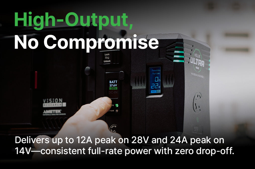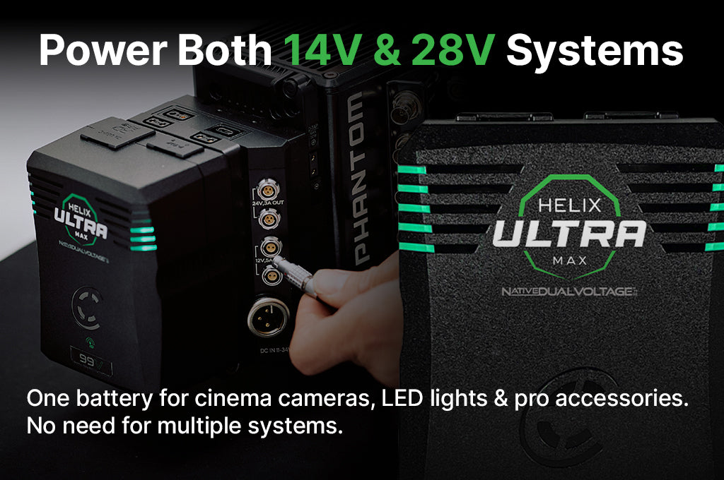 The Helix Max Ultra is the next evolution in Native Dual Voltage™ battery technology, delivering high-efficiency power for cinema, broadcast, and lighting professionals. Designed to support both 14V and 28V applications, it enables seamless operation across cameras, LED lights, and production accessories—eliminating the need for multiple battery systems. Powered by AI-enhanced power management, the Helix Max Ultra dynamically adapts to the power requirements of today’s most demanding platforms, including the ARRI Alexa 35, RED V-RAPTOR XL, and Blackmagic URSA Cine 12K/17K. With up to 12A peak on 28V and 24A peak on 14V, it ensures full-rate power delivery without loss or regulation on the mains. The ultra-durable polycarbonate shell, side-mounted backlit LCD, and compact form factor make it ready for long days on set.