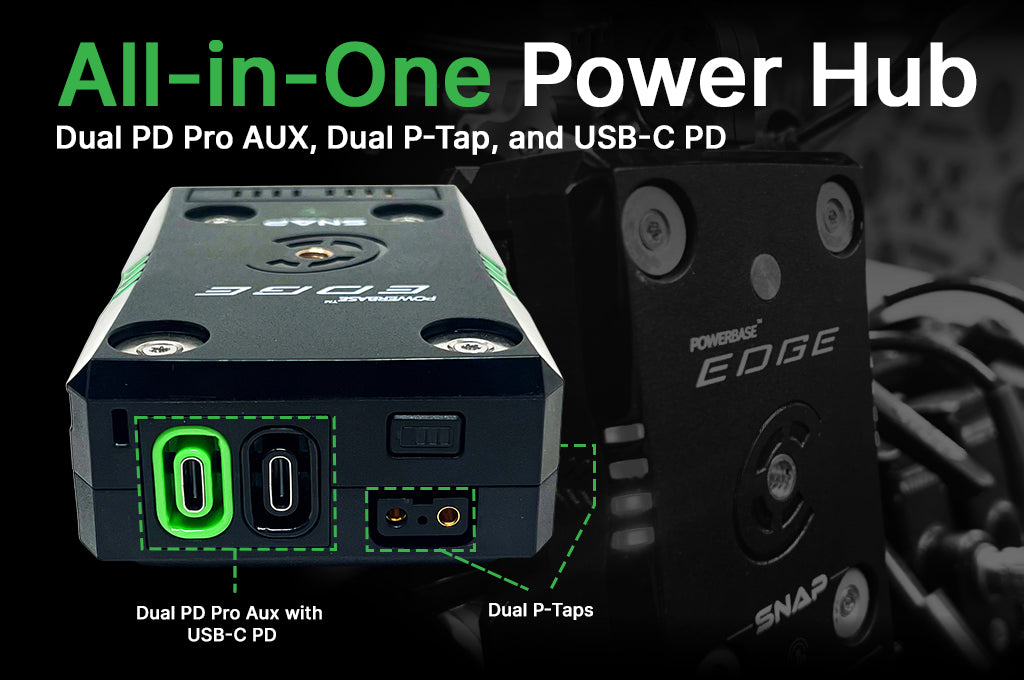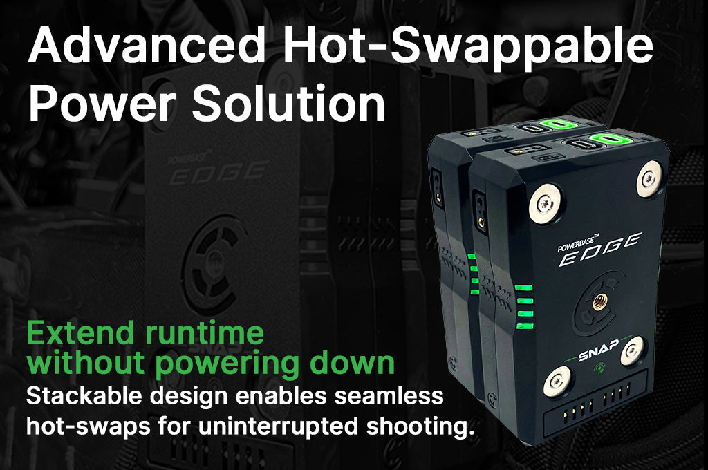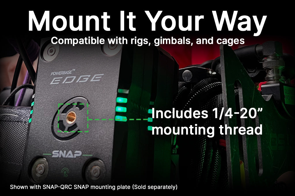 The Powerbase™ Edge Snap™ is a compact, magnetic-mount, hot-swappable battery system built for filmmakers, cinematographers, and live production professionals who need continuous, flexible power on set. Its stackable design allows multiple packs to connect in parallel, enabling extended runtime without powering down gear—ideal for high-pressure shoots and long takes. The magnetic mounting system makes it easy to snap packs into place and swap them mid-production without disruption, streamlining power management for handheld, gimbal, or rig-mounted workflows. Lightweight and portable, the Edge Snap features built-in 1/4-20 and 3/8 anti-rotational threads for seamless integration with camera rigs, V-lock plates, and accessories.