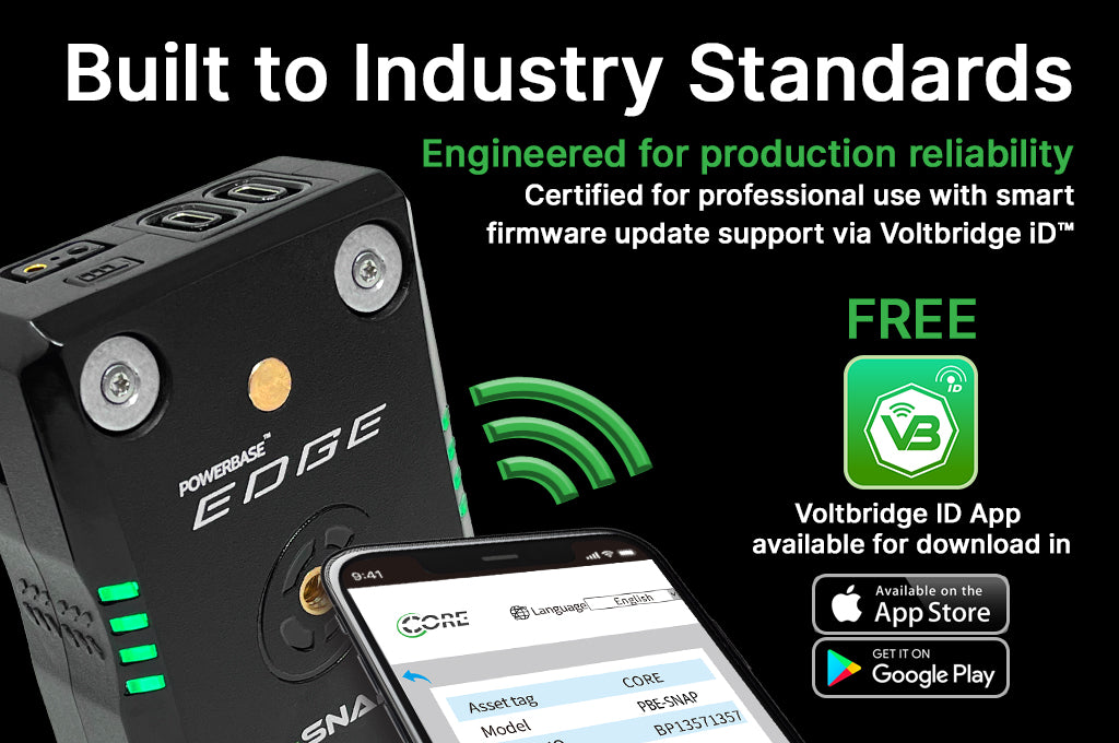 Equipped with dual PD Pro™ AUX outputs (5V–28V), two 12V P-Tap ports, and a USB-C PD port for both input and output, the Edge Snap delivers flexible power to cinema cameras, monitors, LED lights, and wireless systems. Multiple packs can be charged in parallel via a single USB-C PD connection, reducing downtime and simplifying gear setups. A wraparound RGB LED status gauge provides battery visibility from any angle, while integrated VoltBridge iD™ technology offers real-time diagnostics, health tracking, and firmware updates via smartphone. Available in V-Mount and G-Mount options, the Edge Snap delivers uninterrupted, intelligent power for mobile and studio production environments.
